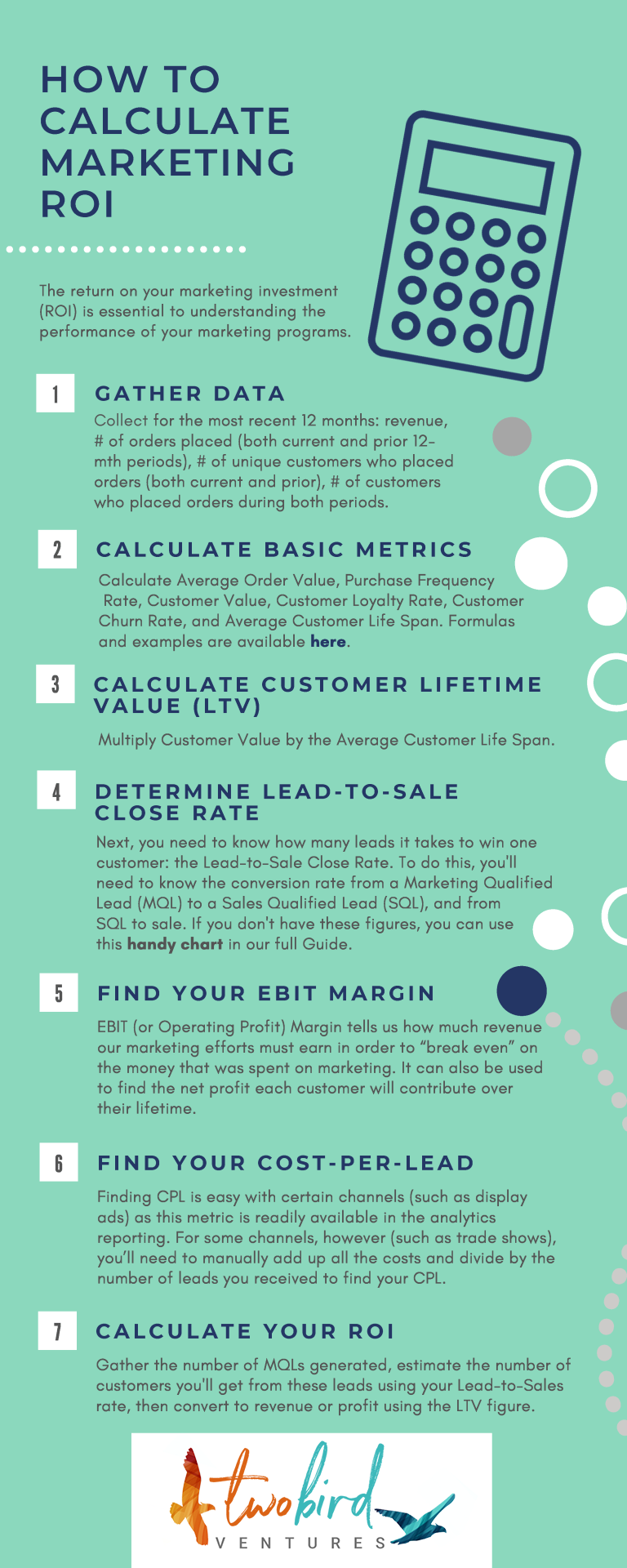 The return on your marketing investment (ROI) is essential to understanding the performance of your marketing programs. Our full blog post and guide, including formulas and examples, are available here.